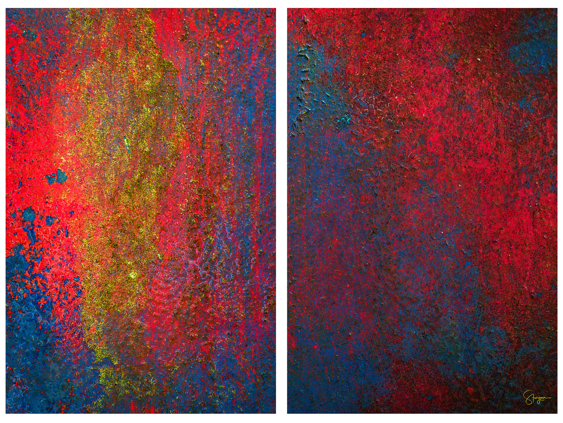 A study in time and texture, where layers of patina reveal both decay and unexpected beauty. Drawn from an aging surface at Old Car City, the piece balances rich, weathered tones with subtle movement, inviting a closer look. Presented as a diptych, each 24 × 36 panel is printed on Fuji Crystal Archive paper and face mounted to TruLife acrylic, giving the surface exceptional depth, clarity, and presence. It carries a quiet sense of history while remaining bold and contemporary.